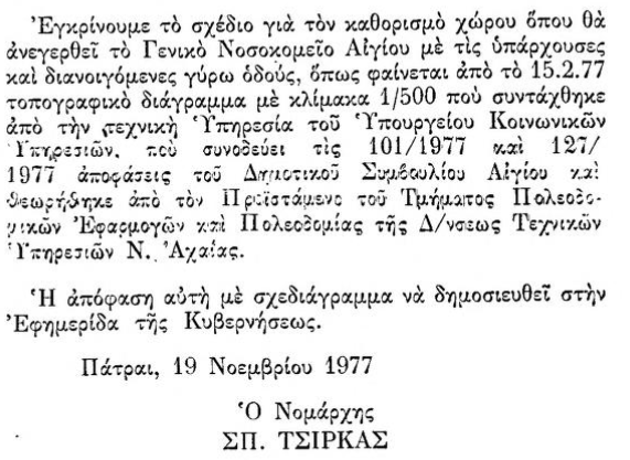 Η κατασκευή ενός σύγχρονων προδιαγραφών μεγαλύτερου νοσοκομείου ήταν ένα πάγιο αίτημα των κατοίκων της Αιγιάλειας ήδη από τις αρχές της δεκαετίας του 1970. Το μέχρι τότε κτήριο είχε συμπληρώσει σχεδόν 70 έτη ζωής και ήταν ανεπαρκές για τις συνεχώς αυξανόμενες ανάγκες περίθαλψης. Έτσι στα τέλη της δεκαετίας 1970, αποφασίστηκε να χρηματοδοτηθεί από το κράτος η ανέγερση ενός καινούργιου σύγχρονου κτηρίου δυναμικότας 120 κλινών, που θα κάλυπτε όλη την περιοχή.